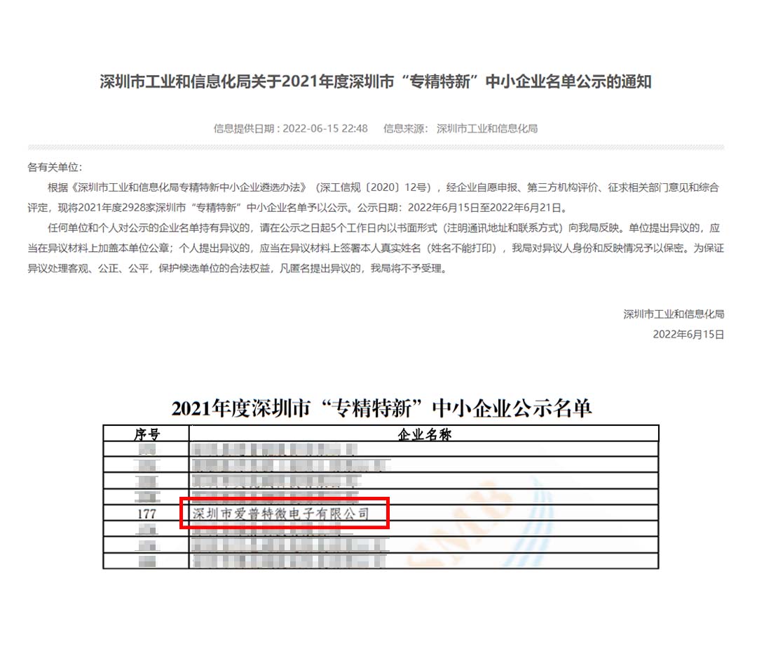2022年6月,深圳市工業和信息化局公布2021年度深圳市“專精特新”企業名單,愛普特微電子憑借優秀的技術創新能力、卓越的市場表現名列榜單之中。