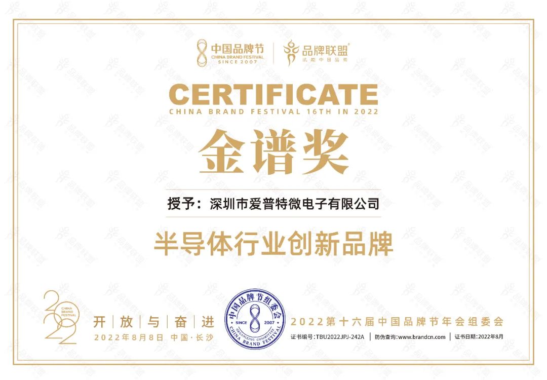 在同期舉辦的“中國品牌節金譜獎頒獎盛典”中,愛普特微電子在眾多品牌中脫穎而出,榮獲“金譜獎·半導體行業創新品牌”大獎。“金譜獎”意為可代表行業形象的品牌企業,旨在表彰行業中表現卓越的行業領跑者以及具有發展潛力、市場反應良好的創新、新銳品牌。此次愛普特微電子榮獲該獎項,是對愛普特微電子綜合實力的高度肯定,也彰顯了愛普特微電子在國產半導體領域的領先優勢。