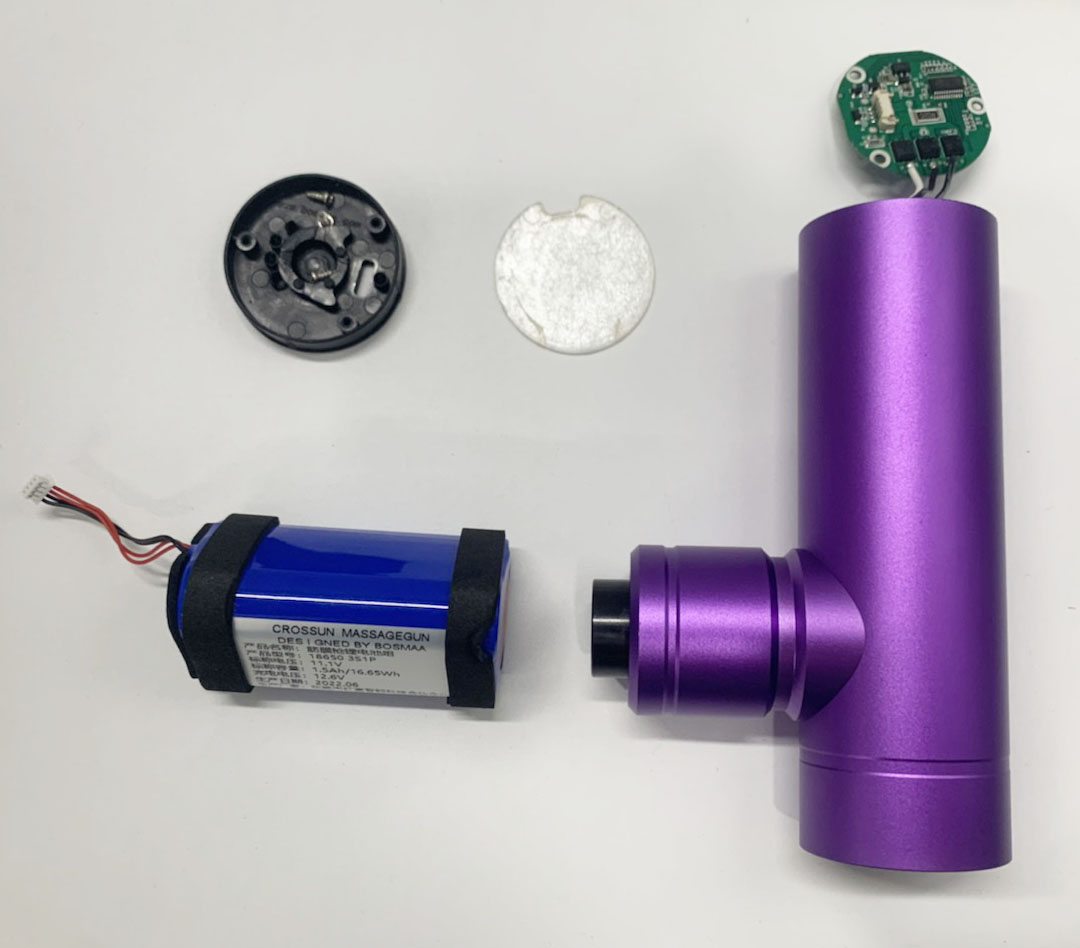 下圖這款筋膜槍內置大容量鋰電池,充電方便,能耗低,續航時間超長;同時具備噪音小、重量輕等優點,使用體驗感得到進一步提升。下面我們就對這款筋膜槍進行拆機圖解,看看這款產品的內部結構以及關鍵器件的設計。