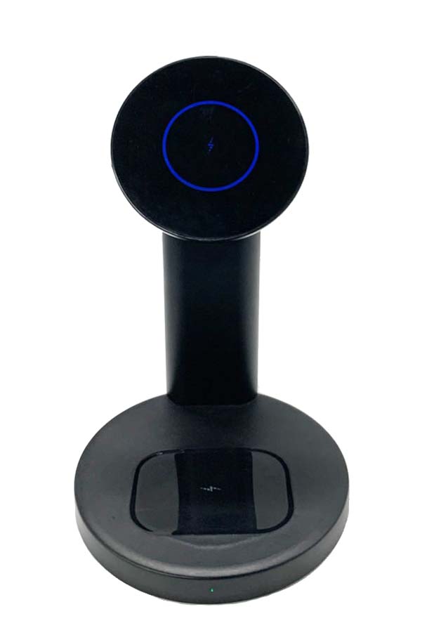 此款無線充電器是立式三充方式,分別有斜面磁吸面板、底部扁平面板和后方扁平面板。整體顏色為黑色,充電區域有閃電小圖標提示。外殼做了兩面高光處理,邊緣圓潤光滑,整體線條流暢,簡潔大方。