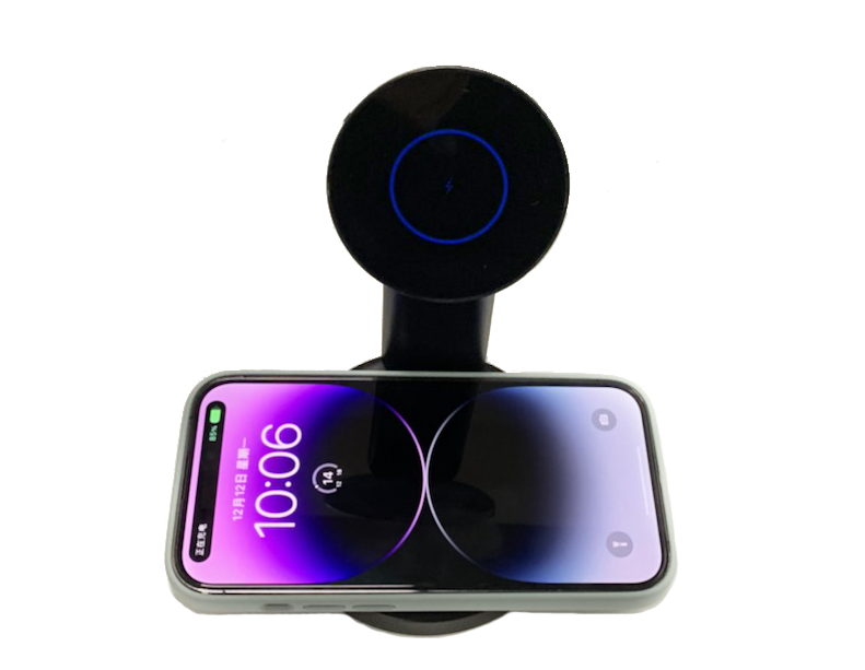 強磁磁條構成的環形吸盤,中間擺放標準線圈,強磁吸的存在讓手機獲得可靠的充電效率。該磁吸盤可90°~ 135°傾斜調節。