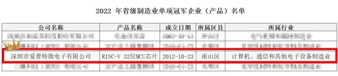 2023年4月7日,廣東省工業和信息化廳2022年省級制造業單項冠軍企業(產品)名單公示結束,愛普特RISC-V 32位MCU芯片榮獲“廣東省制造業單項冠軍產品”稱號。