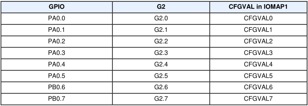 如(ru)圖(tu)中(zhong)(zhong)1對(dui)(dui)(dui)應(ying)的(de)紅(hong)色框所示,標識的(de)是(shi)(shi)APT32F110X GROUP0/GROUP1對(dui)(dui)(dui)應(ying)的(de)復(fu)用(yong)功能列表,左(zuo)邊是(shi)(shi)GROUP0,右邊是(shi)(shi)GROUP1。從(cong)圖(tu)中(zhong)(zhong)2對(dui)(dui)(dui)應(ying)的(de)紅(hong)色框可直觀看(kan)到復(fu)用(yong)列表中(zhong)(zhong)具體功能對(dui)(dui)(dui)應(ying)的(de)配置數值,數值是(shi)(shi)配置在IOMAP的(de)CFGVAL(CFGVAL0~CFGVAL7)域中(zhong)(zhong);如(ru)GROUP0中(zhong)(zhong)選擇I2C_SDA功能,需要在對(dui)(dui)(dui)應(ying)的(de)CFGVAL域中(zhong)(zhong)寫入0x01。