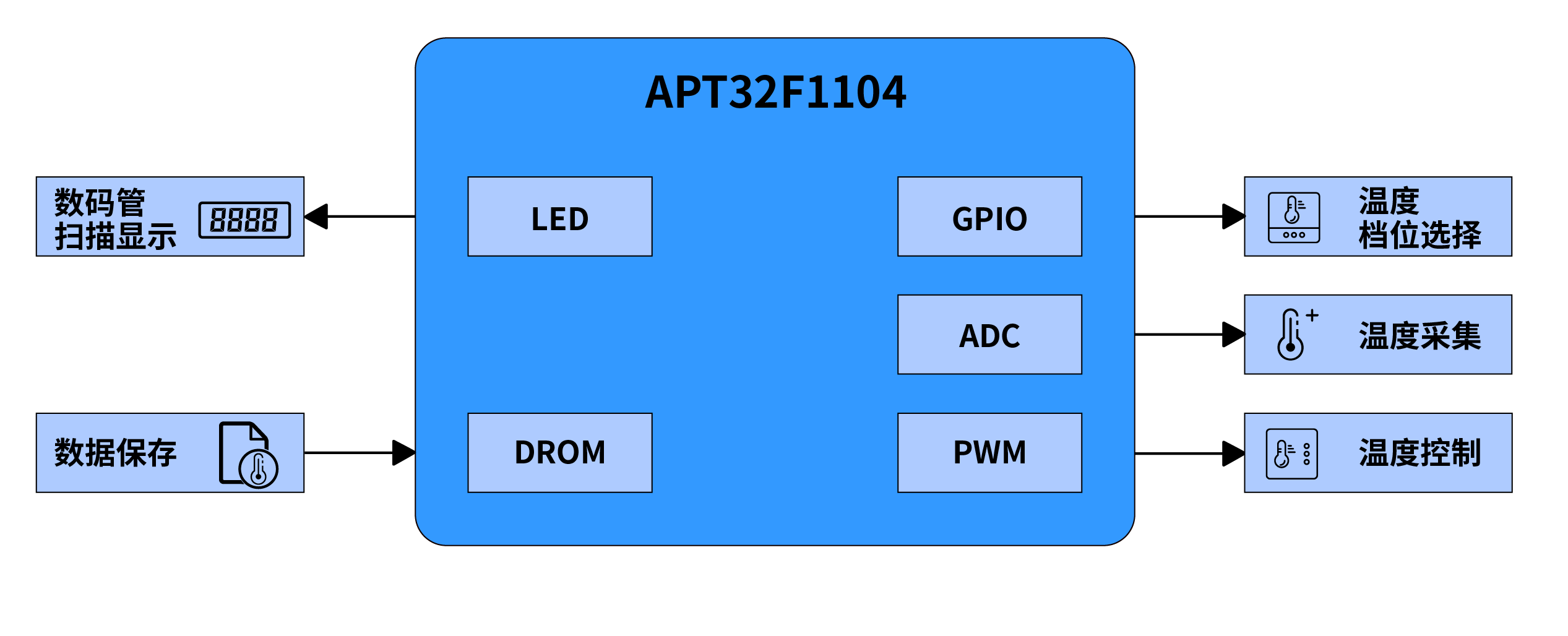 電熱床墊/電熱毯方案中的主控MCU采用的是愛普特全國產RISC核MCU APT32F1104。APT32F1104內置多路通用及增強型定時器,可實現靈活的 PWM 輸出,10x8點的LED自動掃描控制器模塊,用于控制共陰LED數碼管,內嵌支持19個通道的12位ADC最大轉換速度1MSPS,內置數據閃存2K。還支持模擬比較器CMP/DMA/RTC/LCD/Touch等功能。