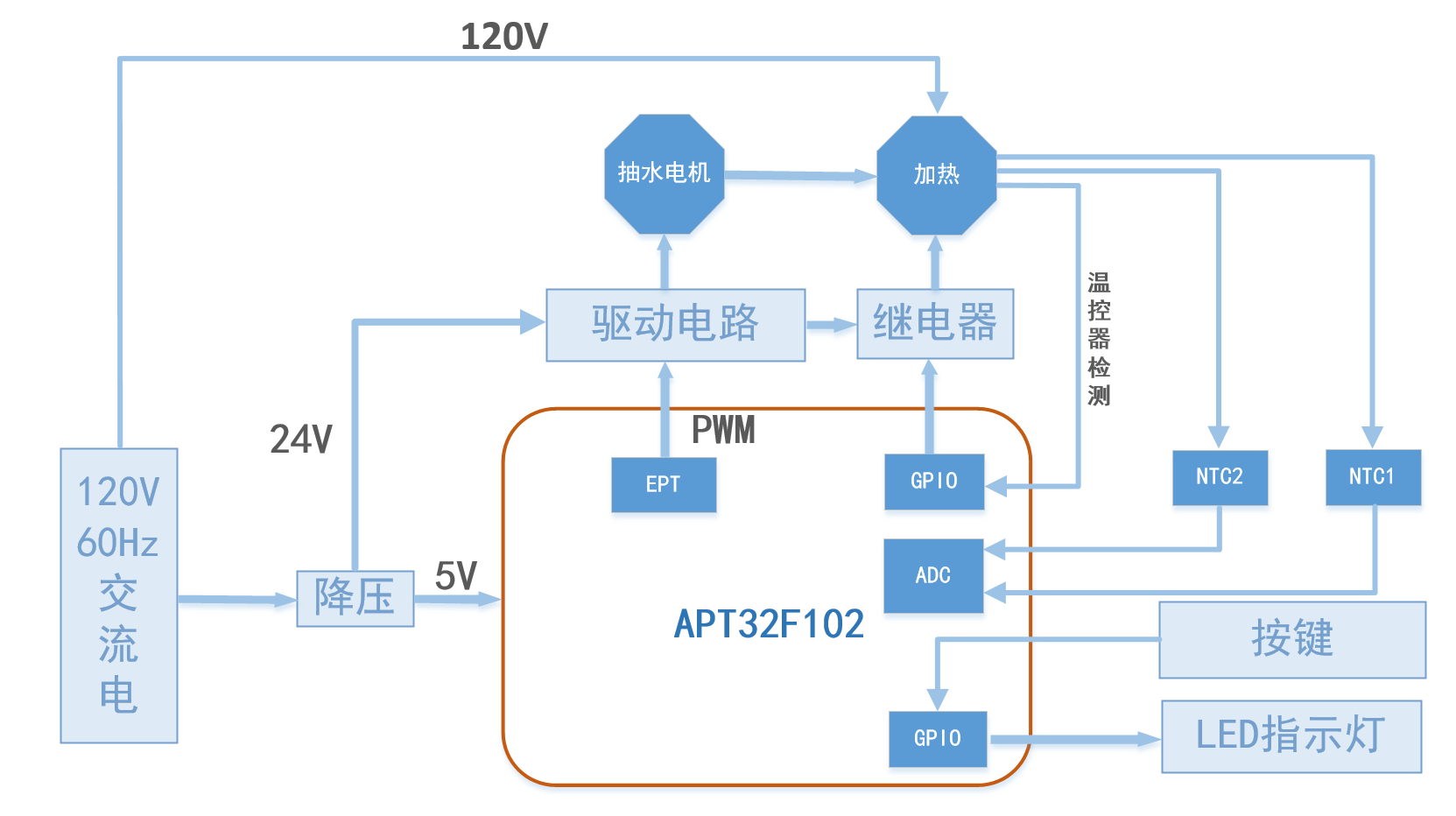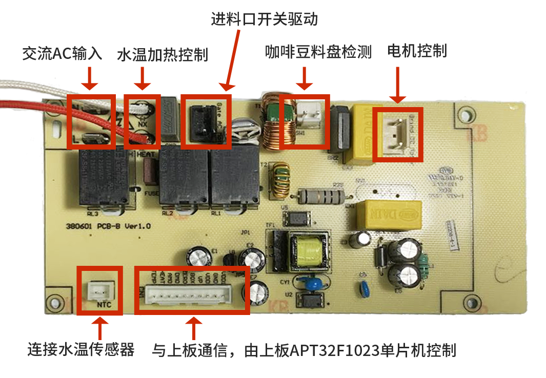 方案主控MCU采用APT32F1023,該款芯片是愛普特全國產RISC核32位MCU產品,支持過流硬件保護,搭載增強型PWM、12位高精度ADC,具備寬電壓、高信噪比、優異的EFT、CS、ESD性能、觸摸檢測等功能。除了咖啡機,還可廣泛應用于智能家電觸控板,如電飯煲、洗衣機、電冰箱、電高壓鍋、破壁機、暖風機等,以及電機的驅動控制,如筋膜槍、吸塵器、電動工具等。