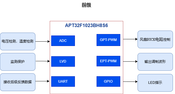 該款(kuan)車(che)載逆變器方案采用的(de)主控MCU是(shi)愛(ai)普特APT32F1023B,這(zhe)是(shi)愛(ai)普特基于自研IP庫(ku)及RISC核研發的(de)全國(guo)產高(gao)可靠(kao)32位MCU,搭載增強(qiang)型PWM、12位高(gao)精度ADC,具(ju)備寬(kuan)電壓、高(gao)信噪(zao)比、優(you)異的(de)EFT、CS、ESD性(xing)能、觸摸檢測等功能。