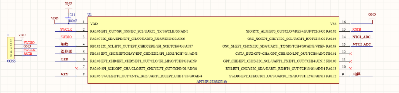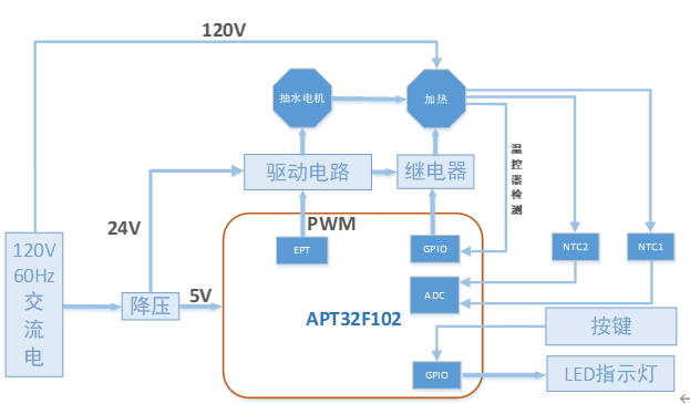愛(ai)普(pu)特微電(dian)(dian)子推出(chu)的(de)(de)(de)基于平頭哥半(ban)導體(T-HEAD Semiconductor) CPU內核開發(fa)的(de)(de)(de)32位(wei)高(gao)(gao)(gao)性能(neng)(neng)低成本單片(pian)機(ji)(ji),工作電(dian)(dian)壓范圍1.8V-5.5V,主頻最高(gao)(gao)(gao)可(ke)達(da)48MHz,片(pian)載(zai)(zai)64K(32Kbytes可(ke)選)程序閃存(cun),獨立2Kbytes數據閃存(cun),含4Kbytes SRAM,豐(feng)富外(wai)設接口,支持硬件CRC,獨立除法器,支持低電(dian)(dian)壓檢(jian)測,支持內部模塊互(hu)聯觸發(fa),搭載(zai)(zai)增強型PWM,搭載(zai)(zai)大電(dian)(dian)流IO,12位(wei)高(gao)(gao)(gao)精度的(de)(de)(de)ADC,觸摸檢(jian)測等功能(neng)(neng)。APT32系(xi)列(lie)芯片(pian),具(ju)備(bei)寬電(dian)(dian)壓、高(gao)(gao)(gao)信(xin)噪比,優異的(de)(de)(de)EFT、CS、ESD性能(neng)(neng),CS通(tong)過(guo)10V 0.15~230MHz A級測試(shi),EFT通(tong)過(guo)±4KV A級測試(shi),ESD通(tong)過(guo)HBM 4000V,MM200V,CDM500V測試(shi)。 以(yi)上這些特性使該系(xi)列(lie)單片(pian)機(ji)(ji)可(ke)以(yi)廣泛地適用(yong)(yong)于各種應用(yong)(yong),除電(dian)(dian)飯煲、洗衣機(ji)(ji)、電(dian)(dian)冰箱、電(dian)(dian)高(gao)(gao)(gao)壓鍋、破(po)壁機(ji)(ji)、暖風機(ji)(ji)等家(jia)電(dian)(dian)的(de)(de)(de)觸控(kong)控(kong)制(zhi)面板外(wai),還可(ke)以(yi)應用(yong)(yong)到電(dian)(dian)機(ji)(ji)的(de)(de)(de)驅動(dong)控(kong)制(zhi),如筋膜(mo)槍、吸塵器、電(dian)(dian)動(dong)工具(ju)等,以(yi)下(xia)是咖啡(fei)機(ji)(ji)控(kong)制(zhi)應用(yong)(yong)方(fang)案。