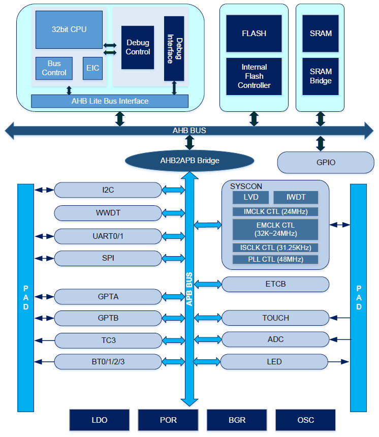 32位高性價比微控制器,基于平頭哥RISC CPU內核開發,最高主頻48MHz,內置高速存儲器,集成多種外設資源,支持觸摸按鍵,支持LED點陣和矩陣驅動。