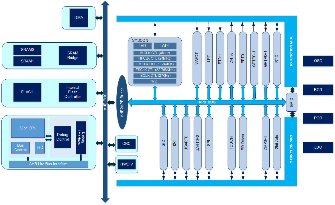 Part NO. | Op.Volt | Temp | Freq | Pin | GPIO | Flash | RAM | Dflash | HWD | DMA | IWDT | WWDT | BT | CNTA | RTC | LPT | EPT | GPTA | GPTB | UART | USART | IIC | SPI | HSIO | SIO | PWM | ADC | CMP | LED Driver | Deep Sleep | Shut Down | PACKAGE |