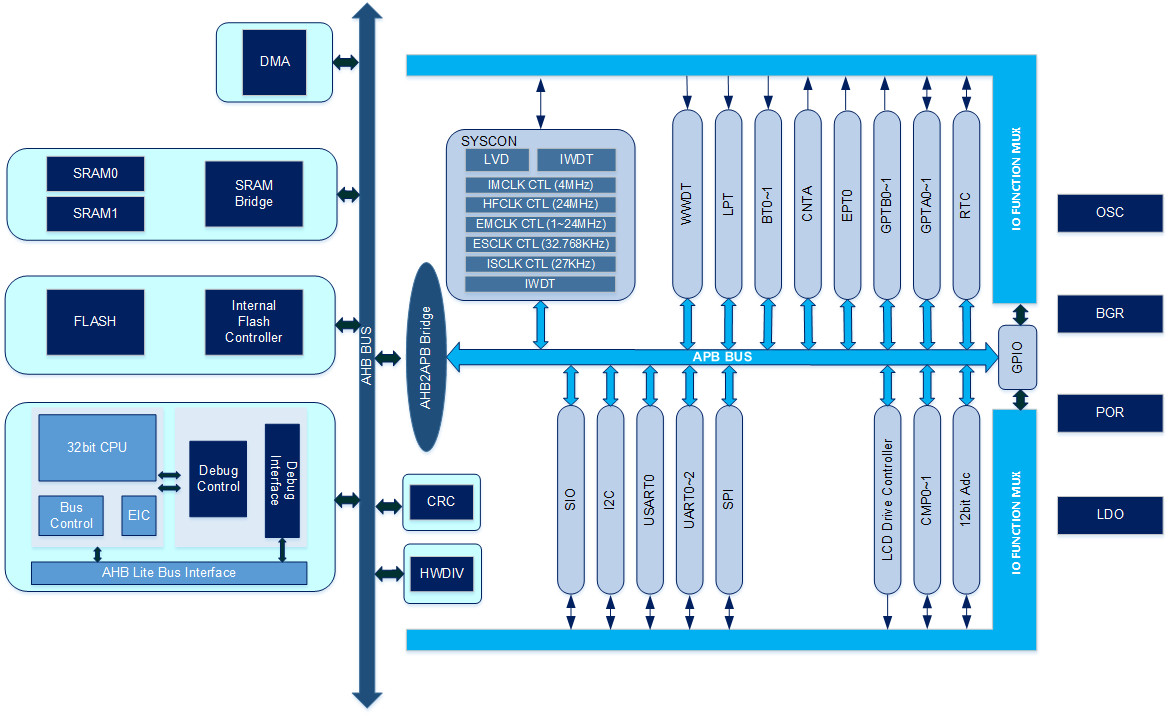 Part NO. | Op.Volt | Temp | Freq | Pin | GPIO | Flash | RAM | Dflash | HWD | DMA | IWDT | WWDT | BT | CNTA | RTC | LPT | EPT | GPTA | GPTB | UART | USART | IIC | SPI | SIO | HSIO | PWM | ADC | CMP | LCD | Deep Sleep | Shut Down | PACKAGE |